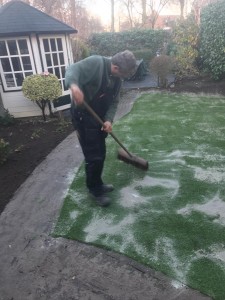 Bij een nieuwbouw woning in Vleuten hebben wij de achtertuin grotendeels voorzien van kunstgras. Allereerst is de tuin afgegraven, daarna is er een zandbed aangelegd en daaroverheen drukverdeeldoek verwerkt. Vervolgens is het kunstgras uitgerold en op maat gesneden. De verschillende stukken zijn aan elkaar vast gelijmd en rondom is de mat vastgezet met U-pinnen om ervoor te zorgen dat de mat mooi gespannen op de plek blijft liggen.