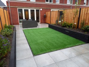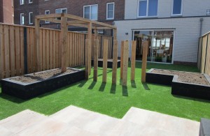 In de nieuwbouwwijk Rijnvliet in Utrecht hebben we bij een woning een nieuwe tuin aangelegd waarbij een groot gedeelte is voorzien van kunstgras, type Finesse de Luxe. Daarnaast zijn tegels gelegd van Cera3line Lux & Dutch Downtown Grey.