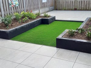 In Nieuwegein hebben wij een bestaande tuin gerenoveerd, waarbij niet alleen de bestrating opnieuw gelegd is maar ook het gras vervangen is door kunstgras. Door de speelse vorm van het paadje, een nauwkeurige klus om het kunstgras mooi strak te leggen. Op het zandbed is drukverdeeldoek verwerkt met daarop het kunstgras. Het gras is ingeveegd met infilzand dat dient ervoor om de grasmat te verzwaren en te beschermen tegen weersinvloeden.