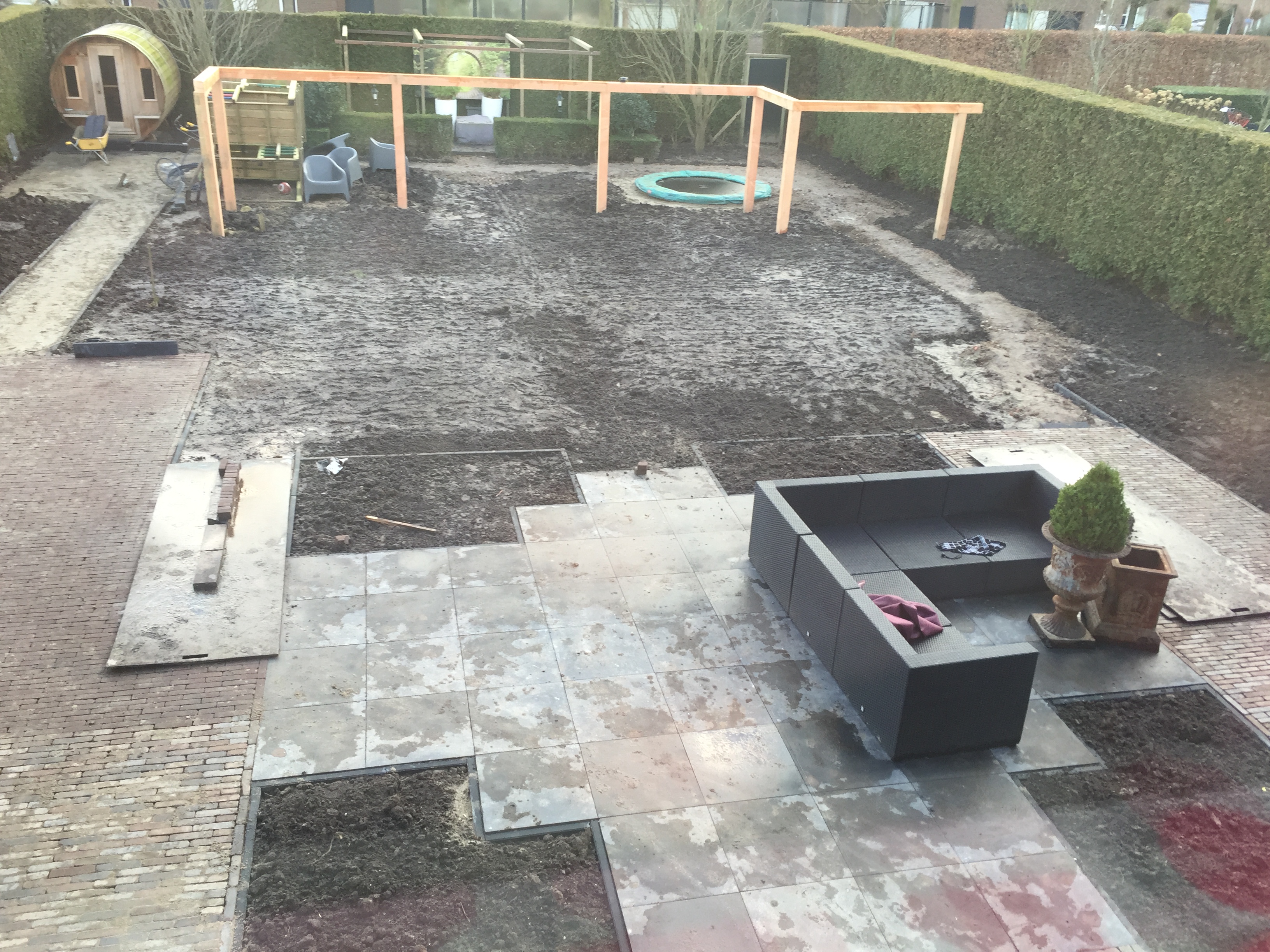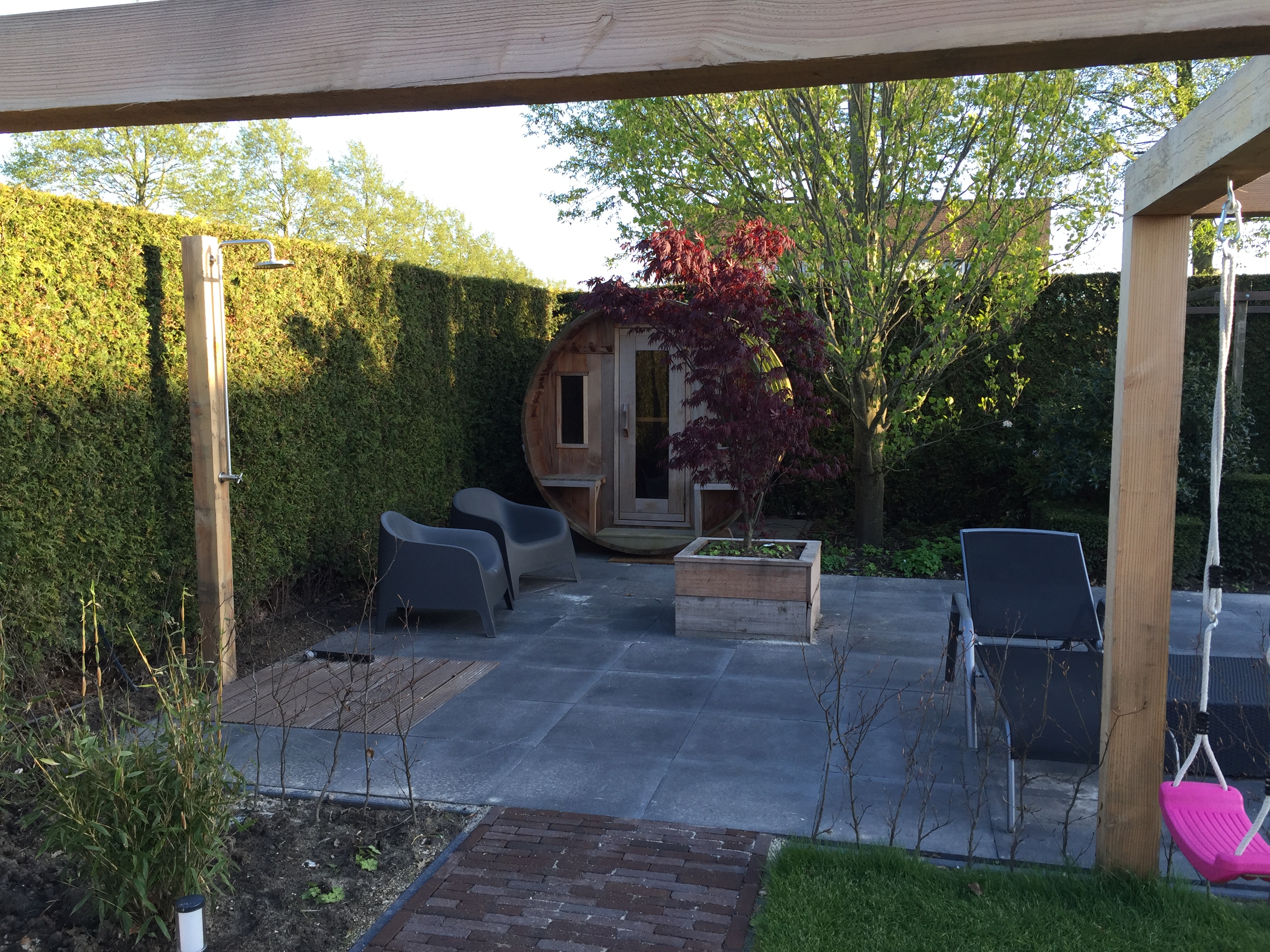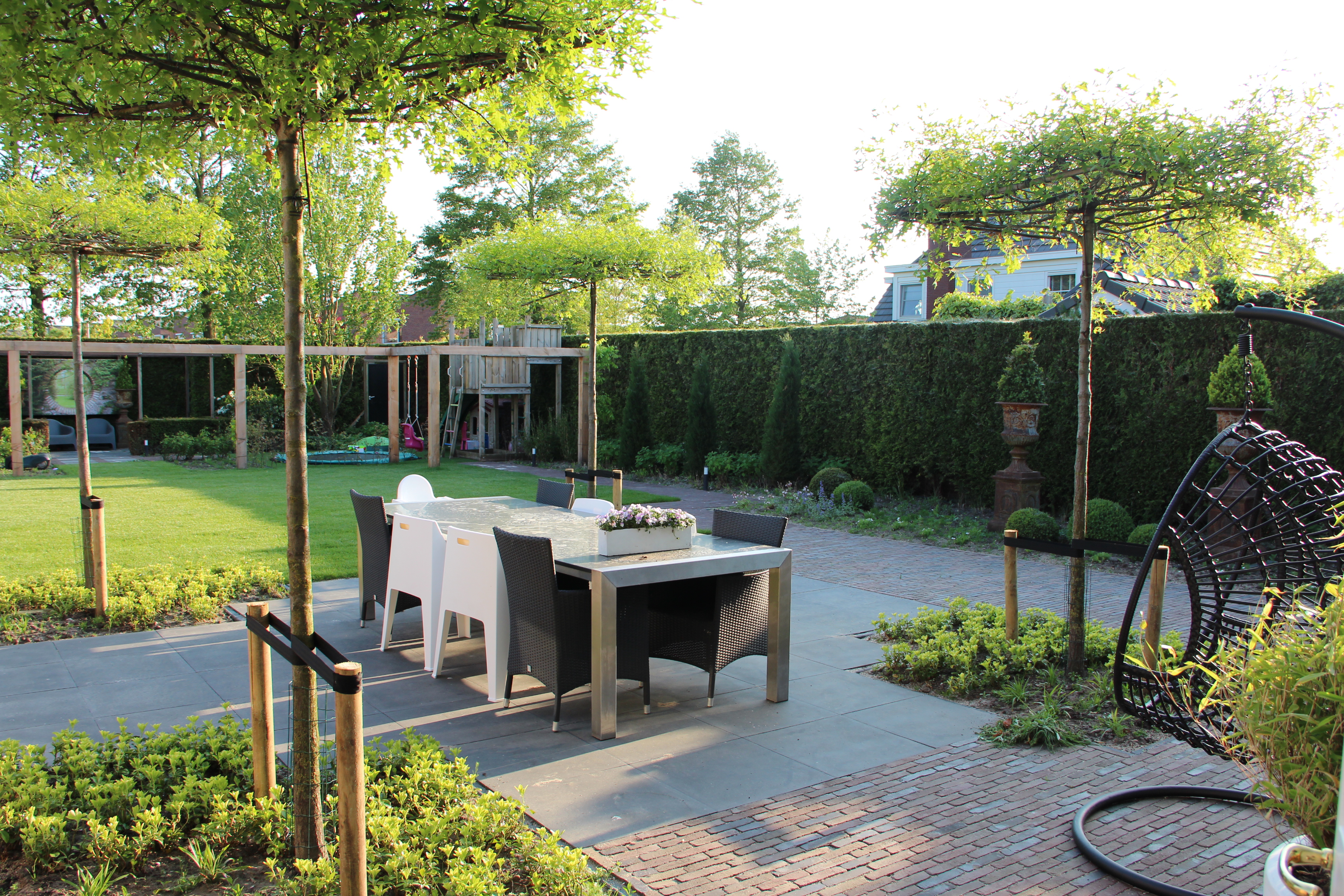 Een prachtige achtertuin voor iedereen. Er is een speelplek voor de kinderen, een plek om te relaxen in de sauna maar ook onder de overkapping van het tuinhuis. Kortom een complete tuin van met alle voorzieningen om te genieten van de tuin en al het groen.