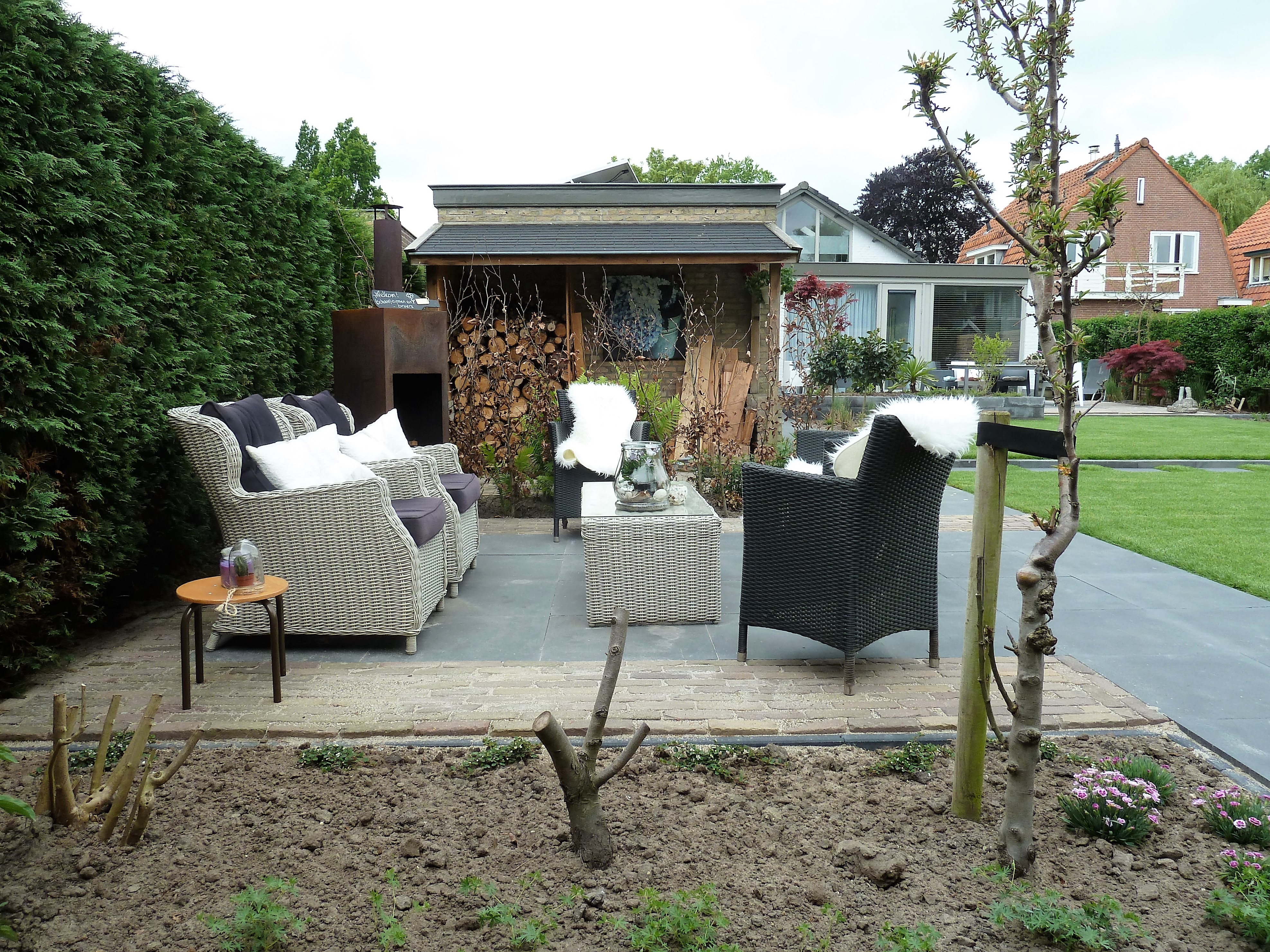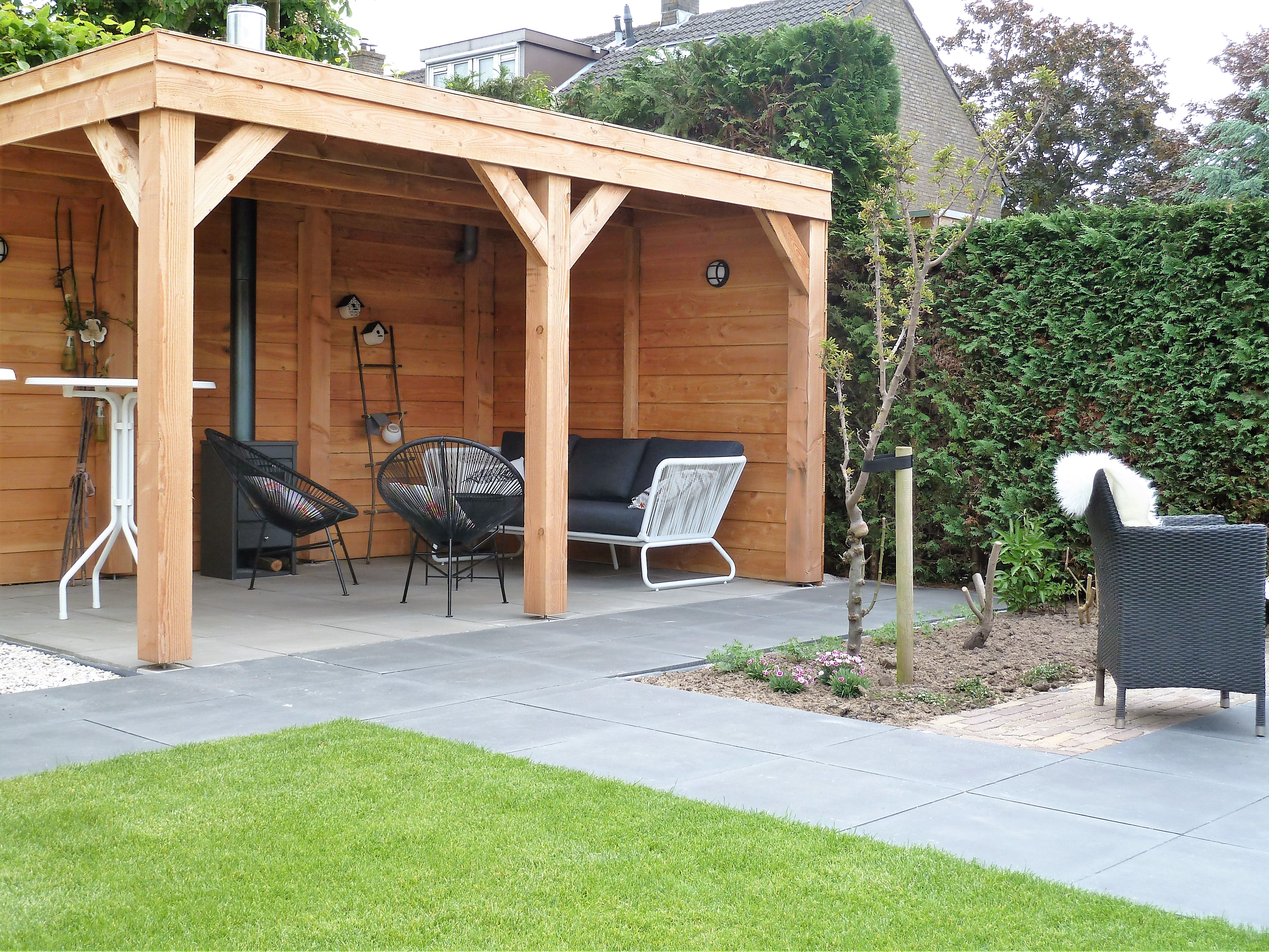 Achterin de tuin is een schuurtje met kleine overkapping en een overkapping (met openhaard) gerealiseerd. Deze zijn speciaal op maat gemaakt van Douglas hout.