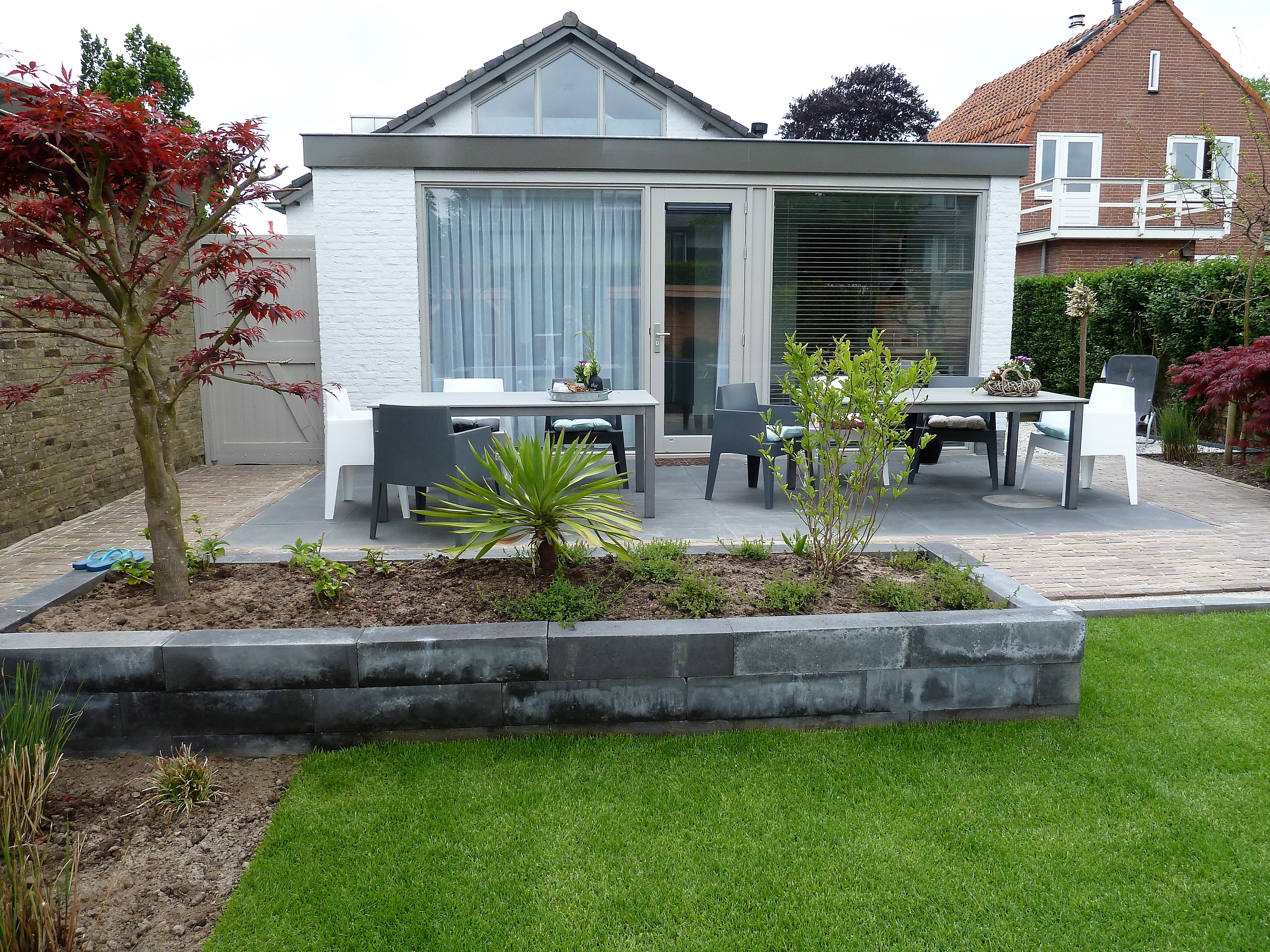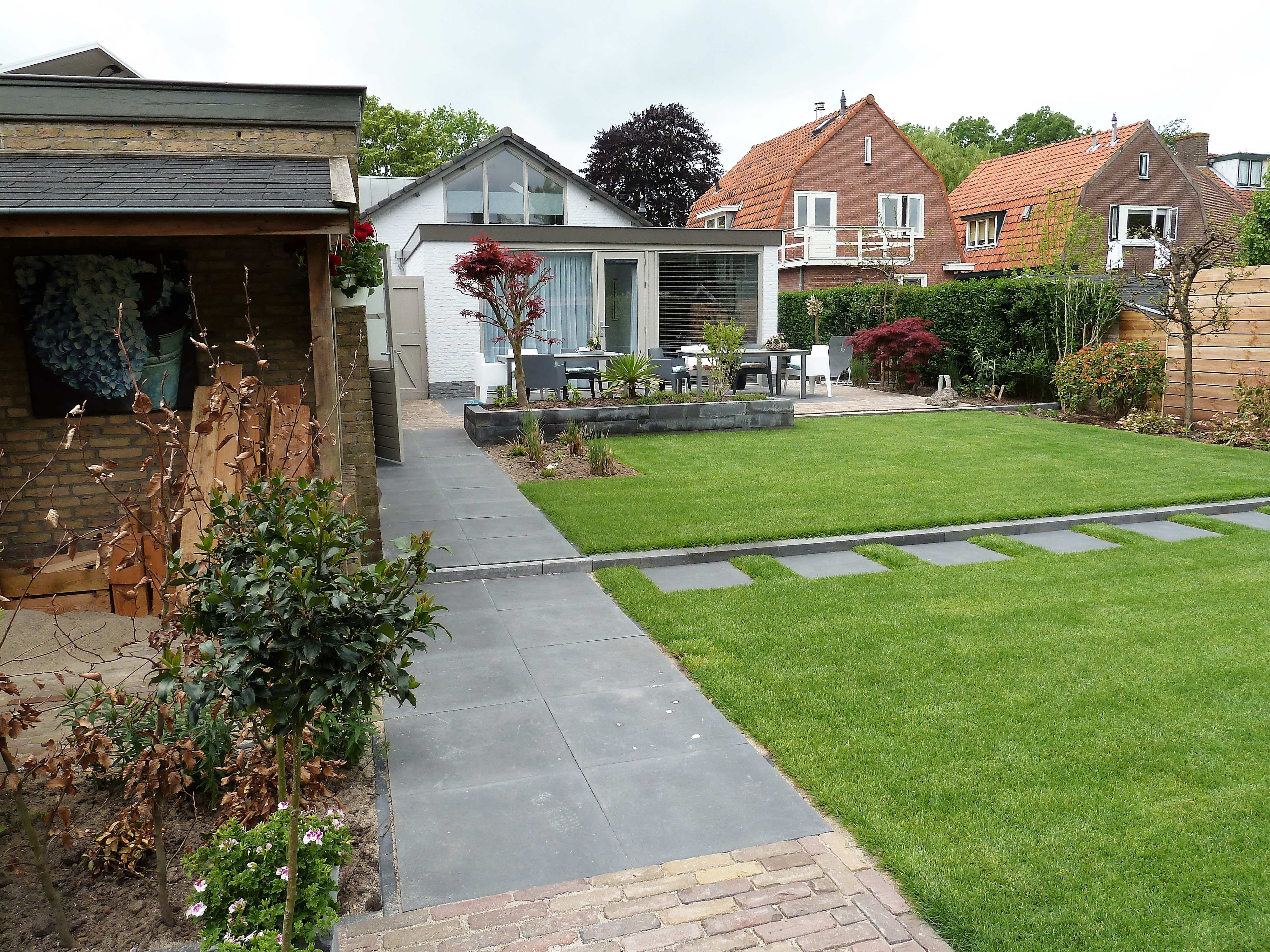 Als bestrating zijn Boulevard betontegels 60×60 cm in de kleur Egmond zwart gelegd in de terrassen en het verbindingspad in combinatie met aanwezige klinkers.
