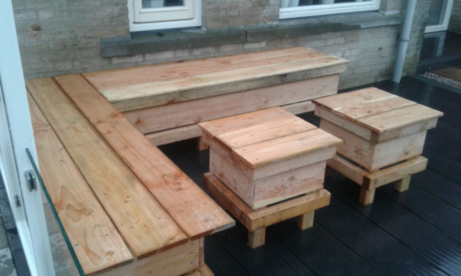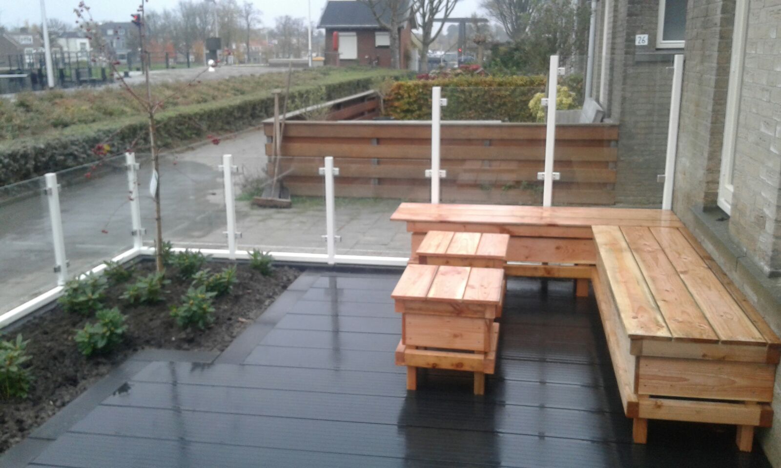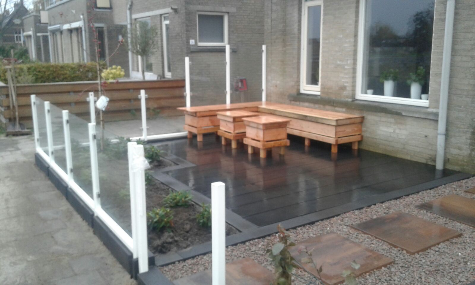 In de tuin is een vlonder van composiet planken gerealiseerd met hierop zelf gemaakte meubelen van Douglas hout.