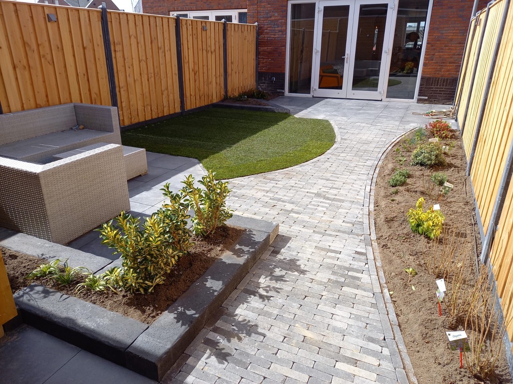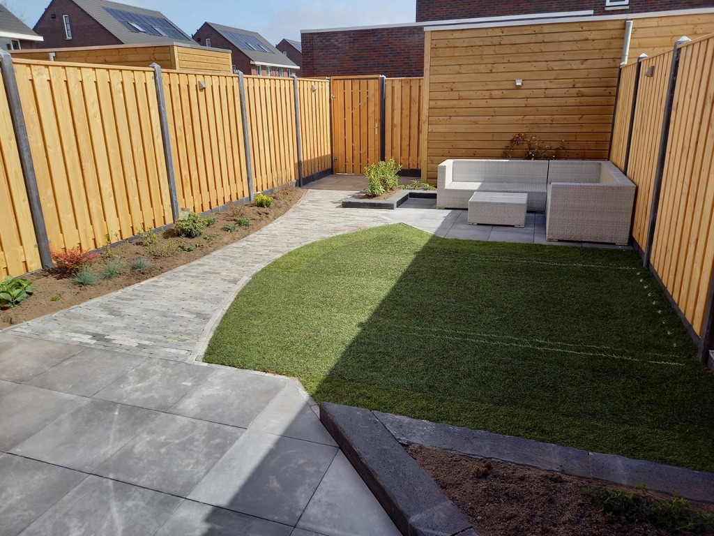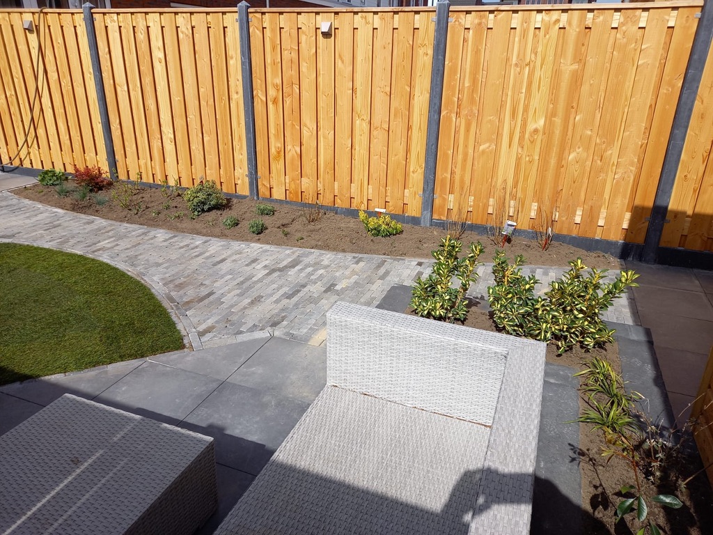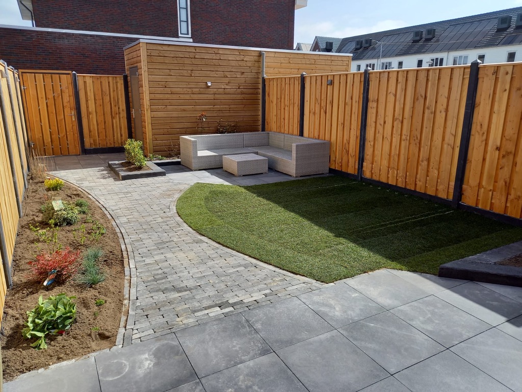 In Wilnis hebben we een tuin gerealiseerd bij een nieuwbouwwoning. Deze tuin heeft een speels effect met ronde vormen en strakke lijnen. Voor het terras is gebruik gemaakt van Flat Tiles tegels van 50×50 cm in de kleur Silver donkergrijs. Voor het pad van het 1e naar het 2e terras zijn Retrostones Foney 5×20 cm gebruikt in de kleur grijs/zwart. Achter in de tuin en voor in de hoek ligt een border met strakke lijnen, gemaakt van zwarte Retro betonbiels 100x20x12 cm. Voor meer kleur in de tuin is er nog een stukje gazon gelegd en beplanting in de border geplant. De verlichting van In-lite zorgt ervoor dat ’s avonds te tuin ook mooi verlicht is. De lampen type Wedge zijn aan de schutting bevestigd.