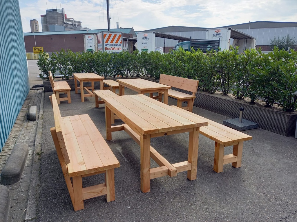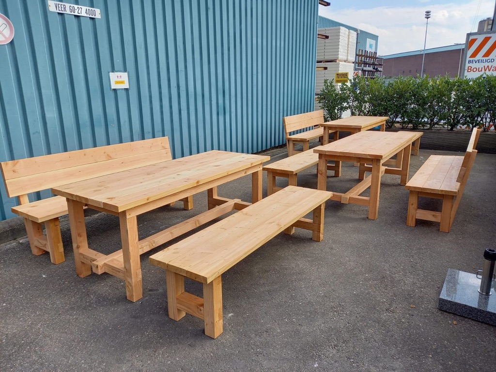 Van douglas onbehandeld hout, bank Jasper met en zonder leuning en tafel Tiemen.