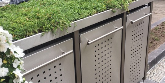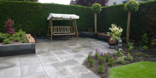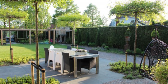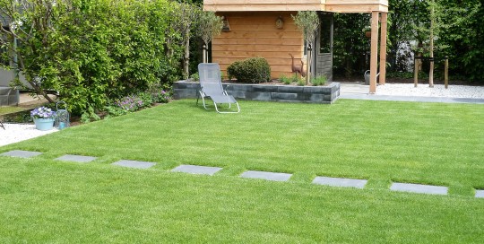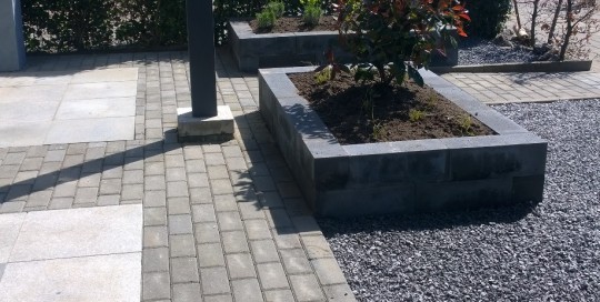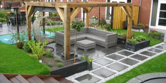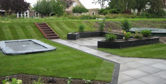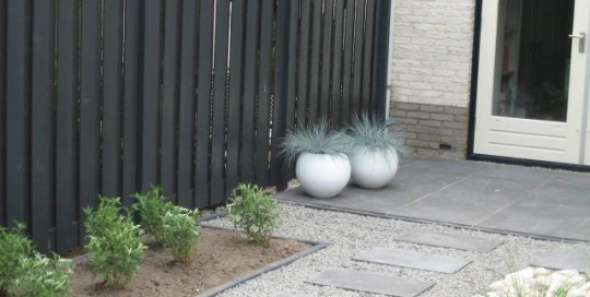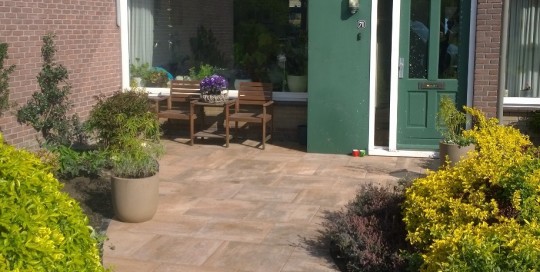 Hierbij foto's van een 5-tal verschillende projecten. Een moderne kliko-standplaats; Een grindschutting met composiet poortdeur in aluminum frame; Een beschut zitgedeelte met openhaard; Een blokhut met luifel; Voortuin met verhoogde borderbakken.