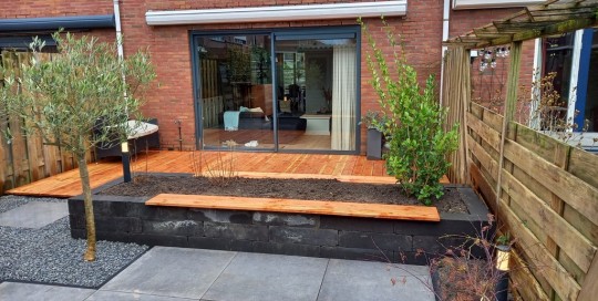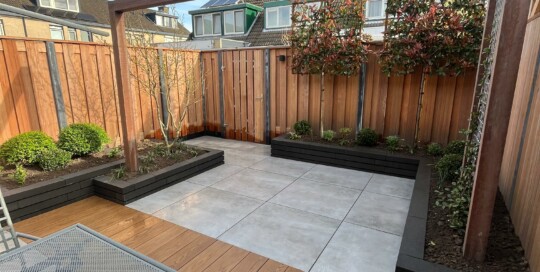 In IJsselstein hebben onze medewerkers een renovatie van de achteruin uitgevoerd bij een tussenwoning. Het terras is gemaakt van 90x90 cm keramische tegels Cera3line Lux&Dutch Bologna Dark Grey gecombineerd met een vlonder van Millboard Coppered Oak. De verhoogde plantenbakken zijn gemaakt van Globe muurelementen. Rondom de tuin zijn hardhouten schuttingen geplaatst met betonnen palen. [...]