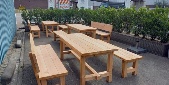 Voor een zakelijke klant uit Utrecht waarvan wij ook het tuinonderhoud uitvoeren, een verzoek ontvangen voor het leveren en plaatsen van drie picknicksets. Van douglas onbehandeld hout, bank Jasper met en zonder leuning en tafel Tiemen.